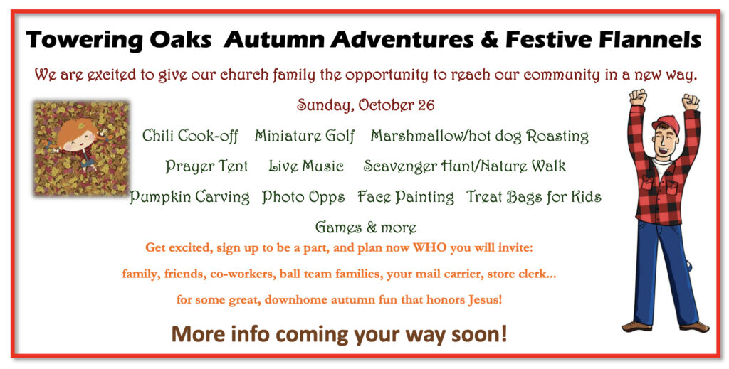 Get excited, sign up to be a part, and plan now WHO you will invite: family, friends, co-workers, ball team families, your mail carrier, store clerk… for some great, down home autumn fun that honors Jesus!