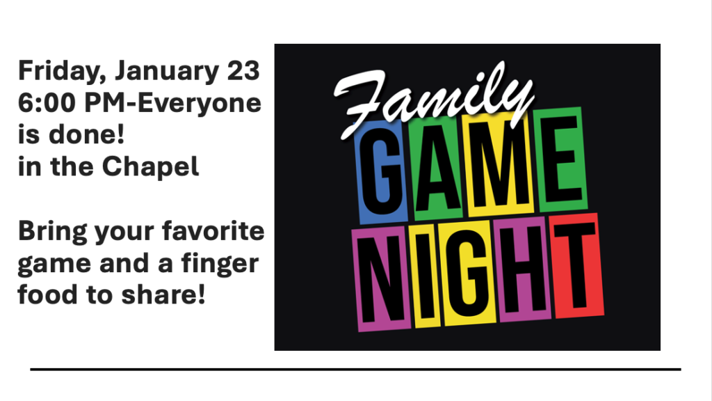 Family Game Night is happening Friday, January 23, from 6:00 PM until everyone is done! Come to the Chapel and bring your favorite game & finger food to share!